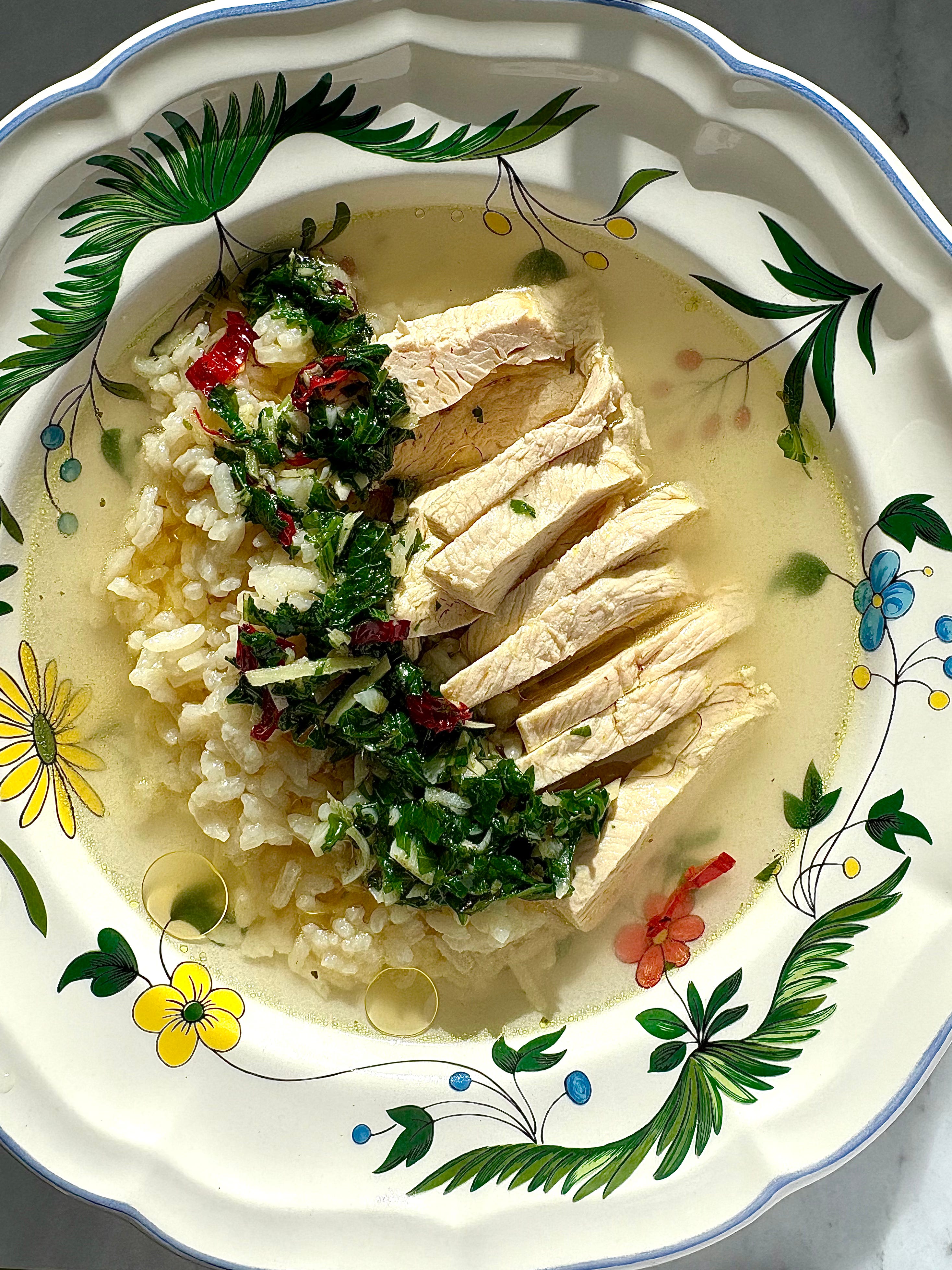 Which brings me to a dish I ate on repeat when we had the flu. Woody, Ash, and me: chicken broth with rice, chicken, and chilli oil. Simple, soothing, and just right.